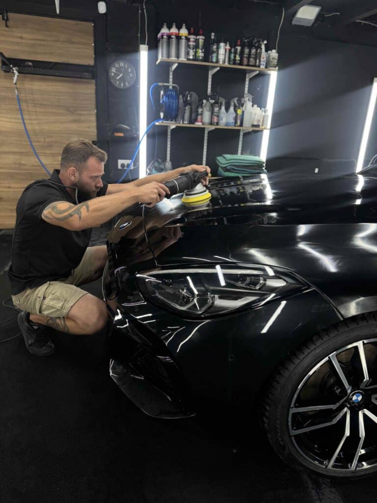 Before applying the paint protection film, the front section of the vehicle was machine polished. This step refines the paintwork, removes light swirl marks and enhances the gloss and clarity of the finish.
