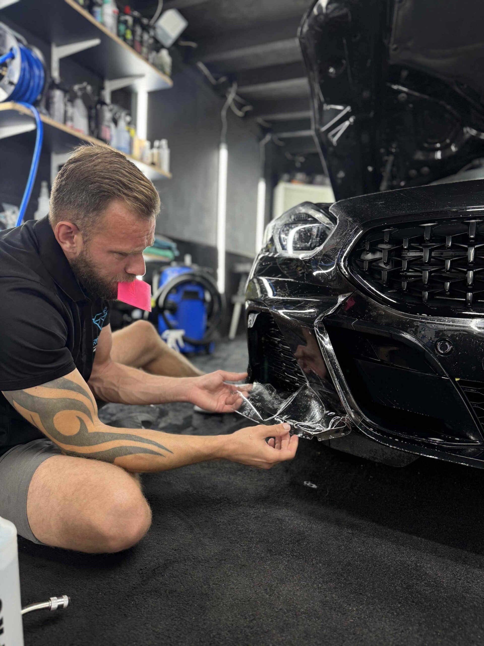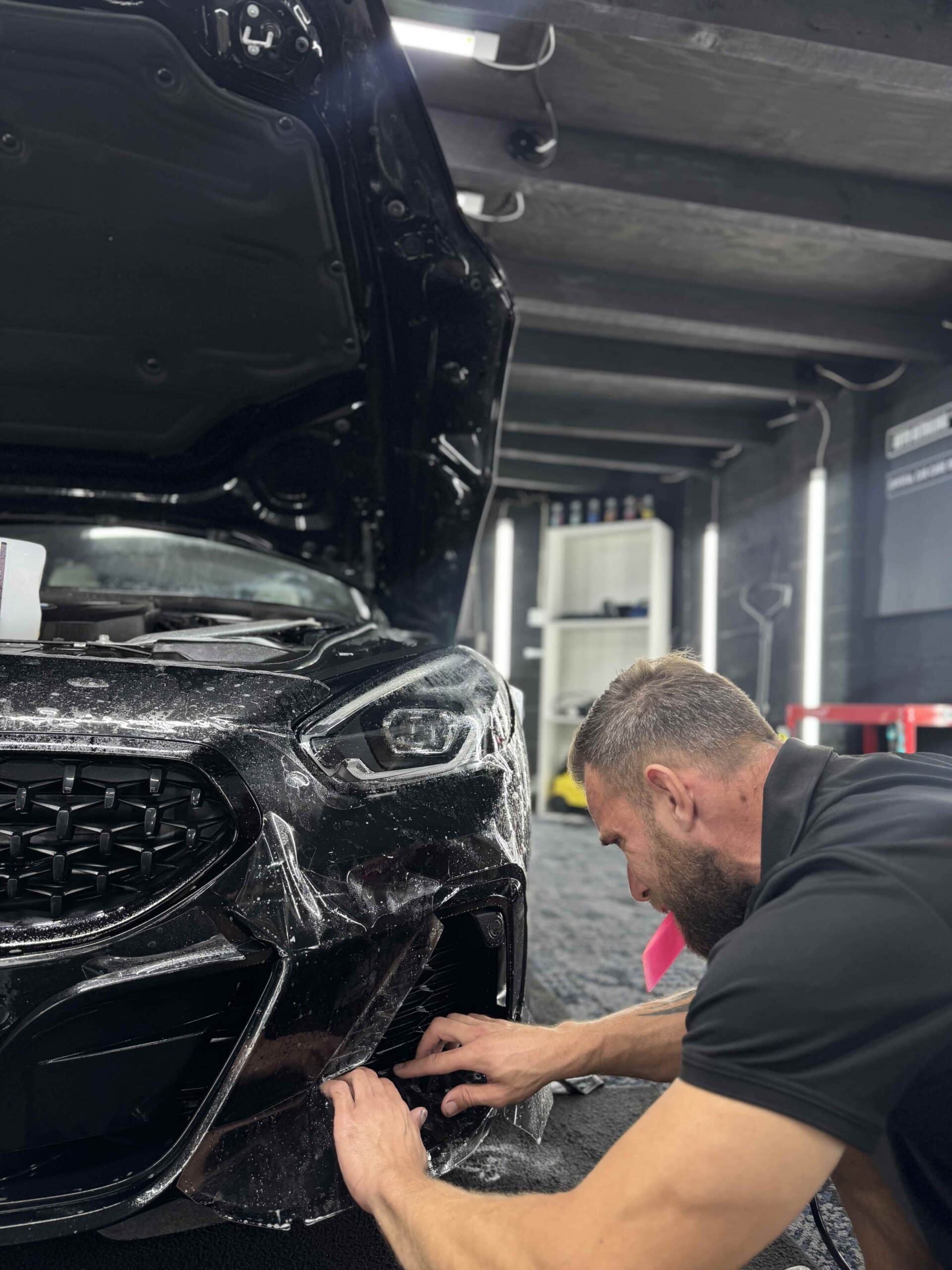 Once the preparation stages were complete, we moved on to the PPF installation process. High-quality paint protection film was carefully applied to the most vulnerable areas of the front end.