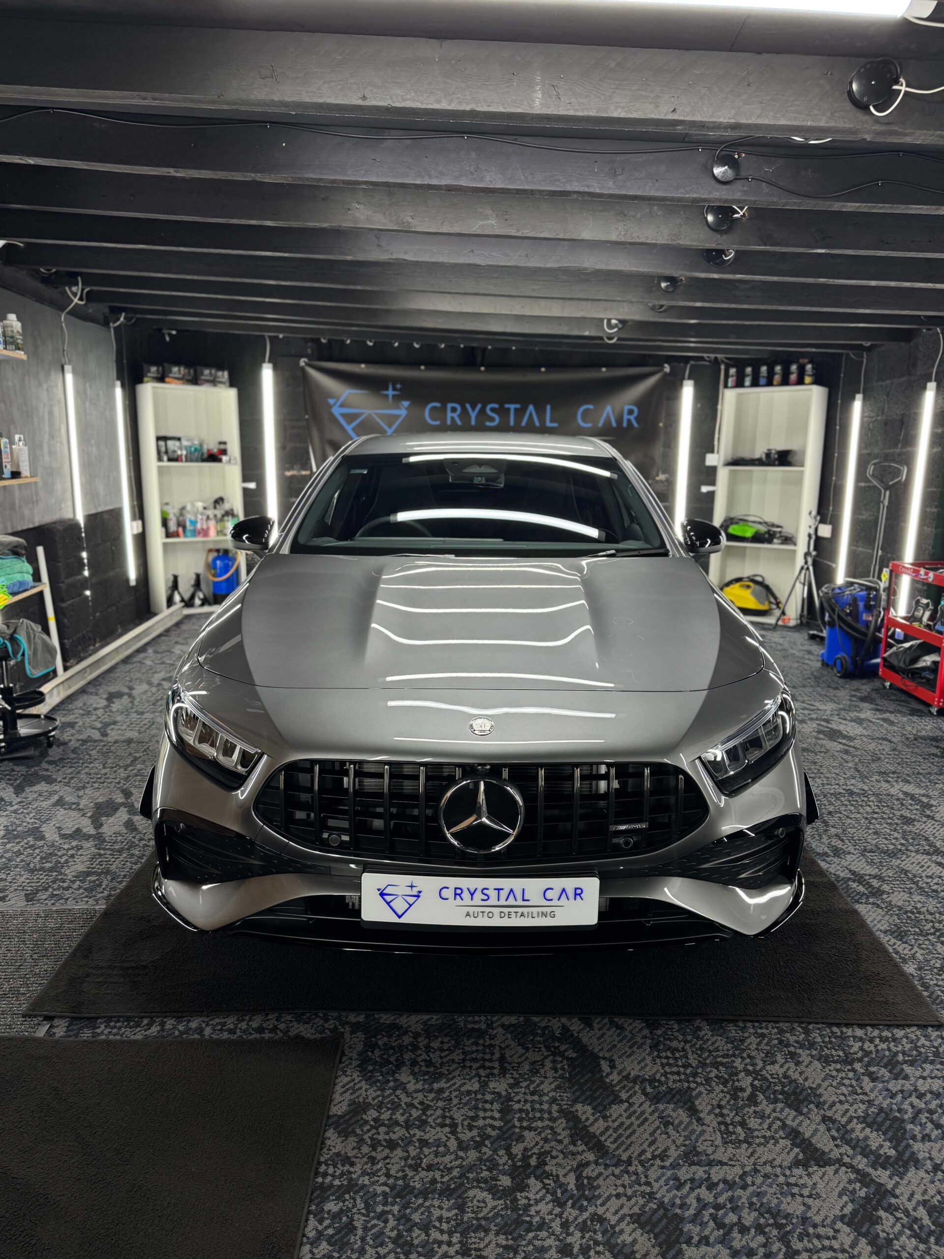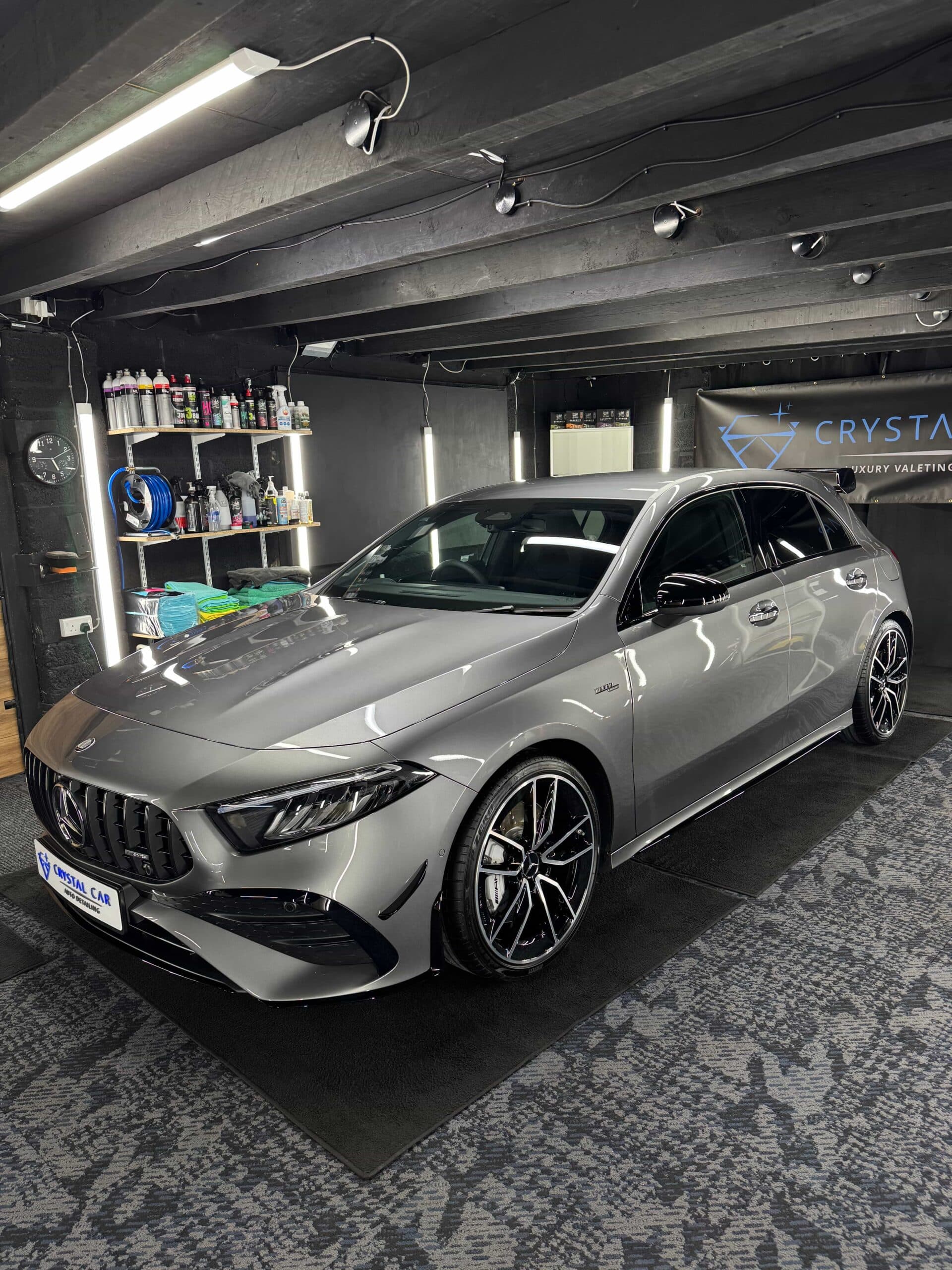 At Crystal Car, we understand that even brand-new vehicles rarely leave the dealership in true showroom condition. This Mercedes-AMG A35 arrived directly from the dealer, presenting well at first glance but showing the typical light wash marring, transport marks, and minor surface imperfections commonly found on new cars.